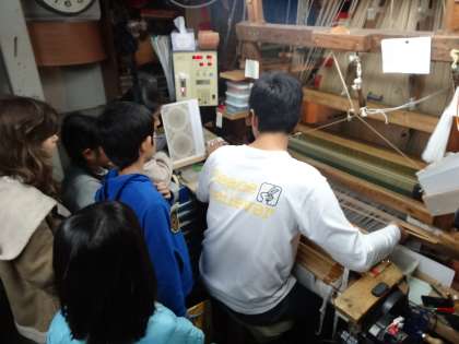 西陣織の手織体験をした3年生の子どもたちは,職人さんのすごさを実感しました。そこで翌日,教えてくださった中村さんの仕事場で,実際に使っている機械や織っている所を見せてもらいました。