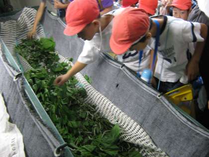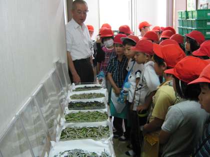 3年生は,総合的な学習の時間に「室町はかせになろう」をテーマにして,蚕の学習をしています。そこで,染色技術センターの八田先生にお世話になって,京都工芸繊維大学の生物資源フィールド科学教育センターで,カイコの育つ様子を見学したり,カイコの育て方を教えてもらったりしました。
