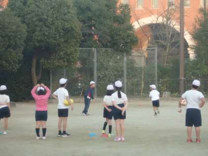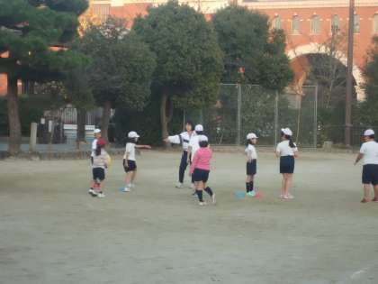 タグラグビー部は毎週月曜4時から練習しています。今年は1年〜5年までの20名の子どもたちが参加しました。準備運動とパス練習の後,ボールを投げては走るランパスの練習をしていました。