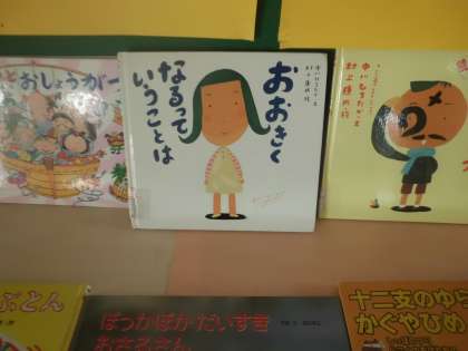 図書のコーナーに1月の本が並びました。今月お勧めの絵本は「おおきくなるっていうことは」(中川ひろたか 文,村上康成 絵)です。