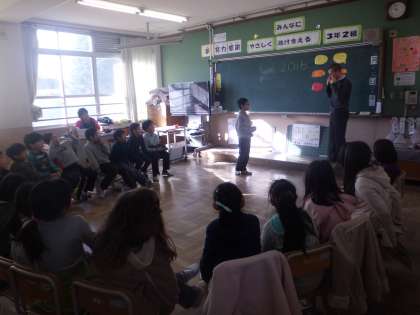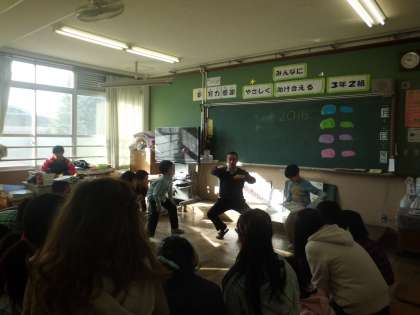 次に,リーダーになった子どもがカードの絵を当てるゲームをしました。”Is it hard ?”と質問すると,チームの子どもたちが”Yes”か“No”で答えました。どのように質問したらよいか迷う場面も見られましたが,体と動かしながらリズムよく話す中で,みんなが楽しく活動することができました。