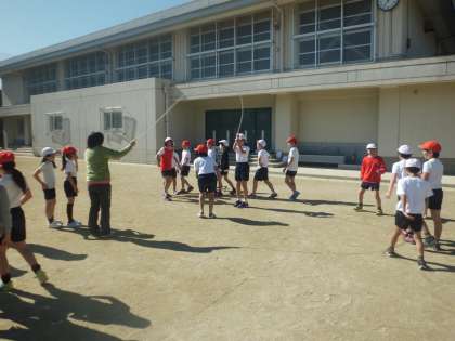 ペース走の後,大なわを使って8の字リレーをしました。1人1回跳んで次の子につないでさらに次々へつないでいきます。全員で声を出して連続記録を目指しました。最高は,なんと26回!!20人のクラス全員が一つになり,とても楽しんでいました。