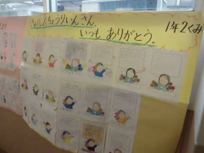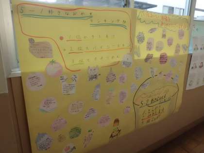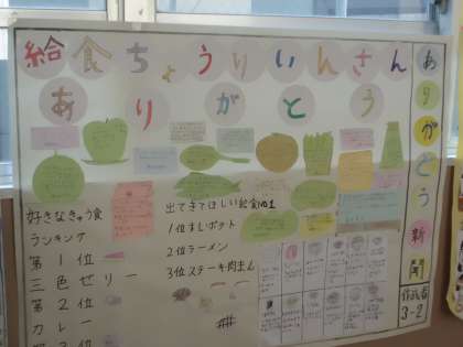 クラスごとに給食調理員さんへ手紙を書いたり,食や給食に関することをカルタにまとめたりして,多目的室の前に掲示しています。クラスの好きな給食ランキングではカレーやかき玉汁が人気でした。季節献立のたたきごぼうや紅白なますについて調べて新聞にしてしているところもあります。