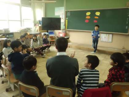 次に「英語で何というの?」と聞くときの言い方を学習しました。”What do you say 〜 in English?”というんだよと教えてもらいました。なわとびのカードを見て”What do you say なわとび in English?”と聞くと,Andy先生が”jump rope”と答えました。”はしごは?””ほうれんそうは?”と聞くと,”radder””spinach”と答えました。