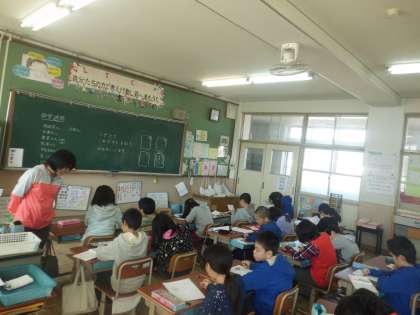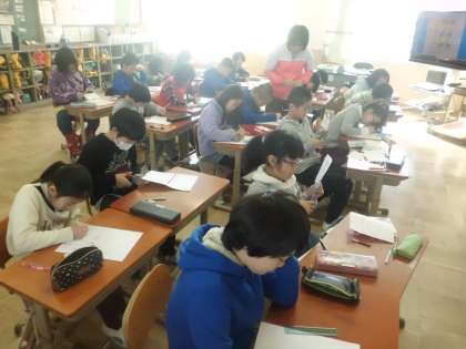 4年生は給食カルタを作りました。字札に合わせて絵札も作りました。受け持った頭の文字が一人ずつ違うので大変です。伝えたいことが語呂よくまとまるように考えていました。