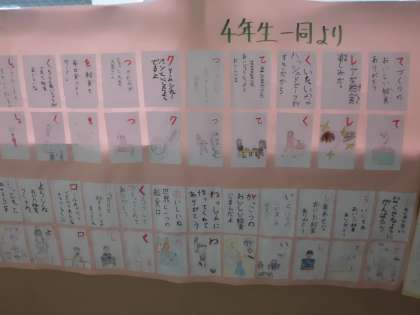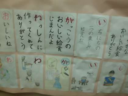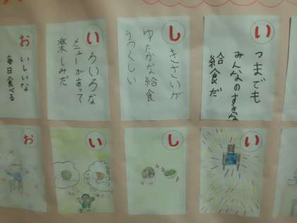 毎日いろいろな献立があって楽しみにしていること,おいしく食べていること,春巻やシチューの好きな献立のこと,好き嫌いせずに食べようと思っていること・・・,たくさんの気持ちがこもったカルタができあがりました。