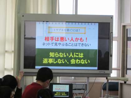 3つ目は,ネットで知り合った人と会ったために怖い思いをした事例です。写真やネットのやり取りだけでは相手が悪い人かどうかを見破ることはできません。知らない人には返事しない,会わないことが鉄則です。ケータイ,スマホはとても便利で現代では必要なものになっています。間違った使い方をしたときの怖さを知り,自分で持つようになった時には正しく安全に使いましょう。
