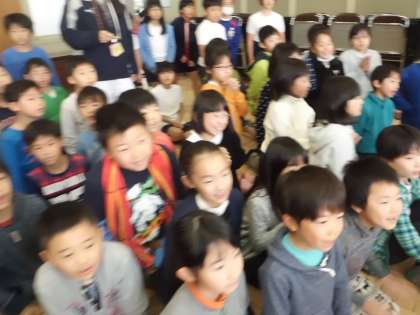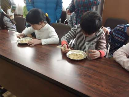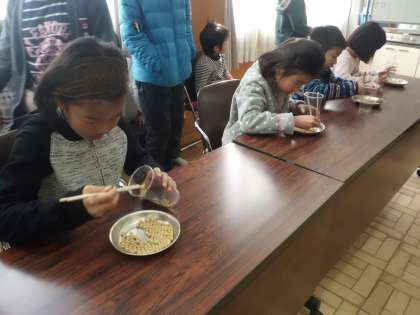 2月8日の中間休みに,給食委員会が低学年の「豆つまみ大会」を開きました。どの学級もお箸の持ち方を練習した後に代表の選手を2名選びました。2人がつまんだ合計の多いクラスが優勝です。競技が始まると「教室ではうまく出来たのに・・・・」「つるつるおはしがすべって,つまめないよ」という声が聞こえてきました。でも,クラスのみんなの応援が力になったようです。