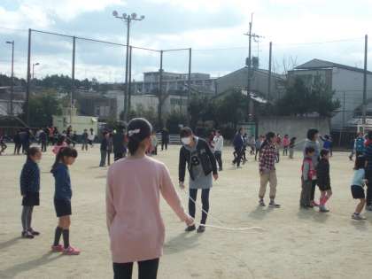 6年生をリーダーにしたグループの様子です。まだ跳べない1年生には,なわをやさしく動かしてゆっくり跳ばせてあげました。