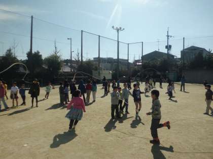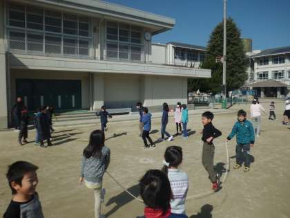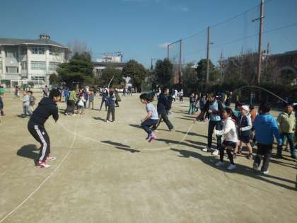 1日目にはできなかったことができるようになっています。子どもたちの上達は早いですね。なわを回している上級生もタイミングをうまくとってあげているようです。本番までまだまだ上手になりそうですね。