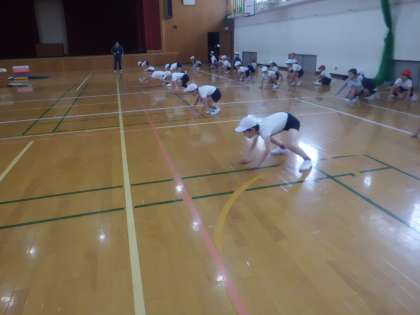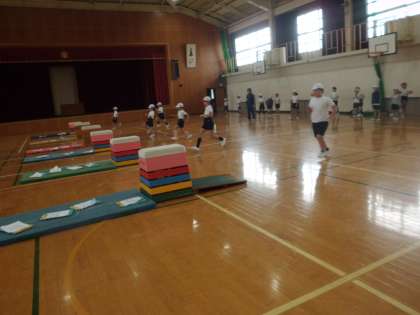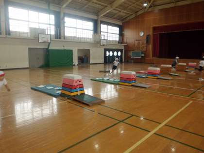 ただのリレーではなく,途中で踏み込み台を両足で踏み込む動作を加えたり,蛙跳びで体を支えたり,跳び箱を跳ぶのに必要な動作を加えたりしたリレーでした。体の動かし方も上手で,盛り上がったリレーになりました。