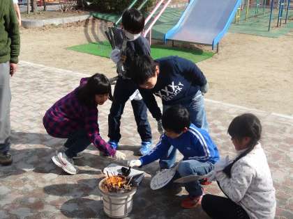 子どもたちは,割り箸の組み方や新聞紙の入れ方,炭の置き方やマッチの使い方を調べていたので,みんな「はやくお餅焼こう!」と意気揚々でした。ところがなかなかうまくいきません。火がすぐに消えてしまったり,炭がうまくいこらなかったり・・と苦戦しました。「言うは易し行うは難しやな…」とつぶやく子どもたちもいました。