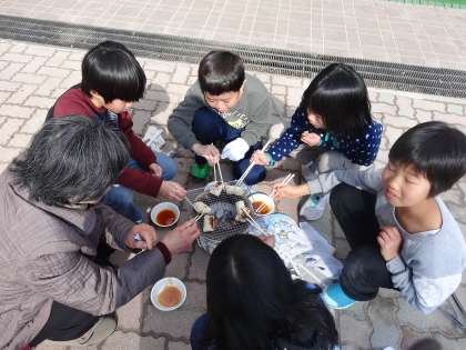 ようやく炭のいこり具合がよくなりお餅を網にのせると,お餅がふっくらと焼き上がりました。子どもたちは「おししい!」と言いながら,砂糖醤油につけていただきました。