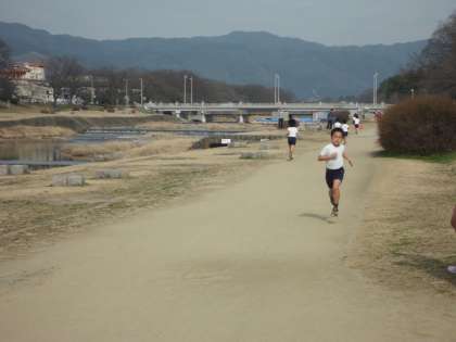 低学年の記録会の様子です。先導の竹原教諭と一緒に帰ってきたのは2年生のM君でした。そのあと続々とゴールして,大文字駅伝予選会と同じ1500メートルのコースをみんな元気に走り切りました。