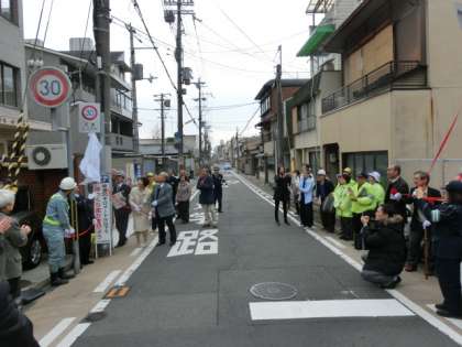 室町学区の今出川通・烏丸通・寺之内通・新町通に囲まれた区域(ゾーン)を時速30KM以下に規制する「ゾーン30」の運用が開始され,3月8日(火)午後3時より上京警察署長・上京区長をはじめ多くの関係者・地域の方のご出席のもと,室町小学校で開会式及び学校前での啓発活動が行われました。