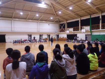 「6年生を送る会」を行いました。全校で集まる最後の会です。1〜5年生が6年生を拍手で迎えました。準備と運営の計画委員会と代表委員会の子どもたちが進めました。