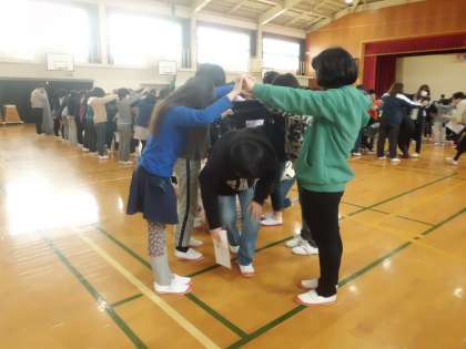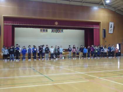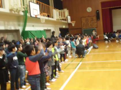 運動会の組体操の様子をバックにして,みんなで6年生の思い出の曲「にじいろ」を歌いました。最後は6年生がお礼に「ハピネス」を披露してくれました。歌の選曲や言葉はすべて自分たちで考えたそうです。