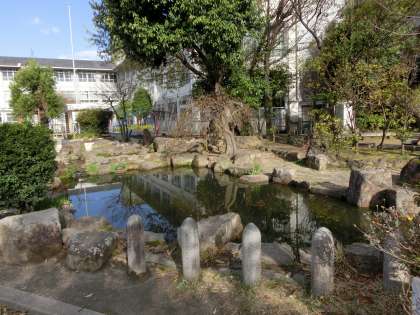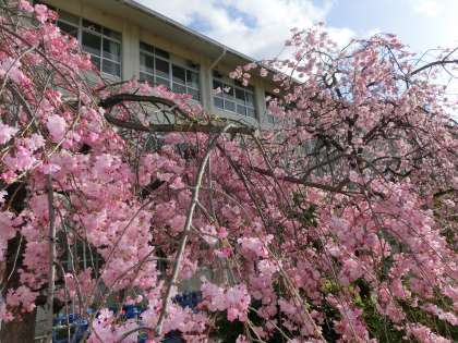 児童玄関入口横のしだれ桜も満開です。東門を入ったところにあるビオトープでは,鯉たちが子供たちの登校を待っています。