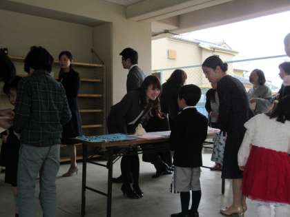 子どもたちは少し緊張しながらも保護者の方と一緒に校門をくぐり,受付でしっかりと自分の名前を言っていました。そして,6年生の子ども達に名札をつけてもらい,教室まで連れて行ってもらいました。
