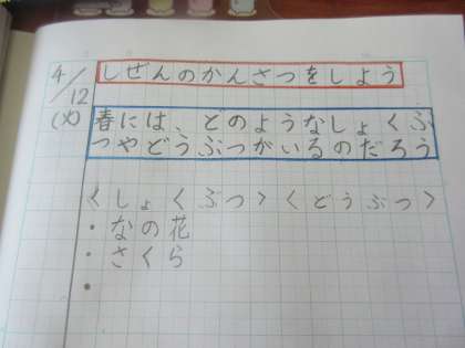2組は,理科の学習をしていました。春に見られる植物や動物について話し合っていました。ノートには単元名,めあてが丁寧に書かれ,学習を頑張っていこうという思いが感じられました。