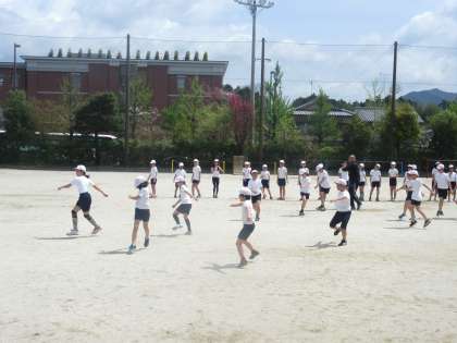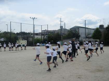 5年生は,体育の学習を学年で行っていました。もう高学年。自分たちで体育倉庫のかぎを取りに来て,てきぱき活動していました。はじめに,準備運動を行いました。クロスステップをしたり,ストレッチをしながら走ったり子どもたちも楽しそうに取り組んでいました。