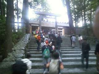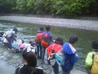 無事に伊勢神宮の内宮に到着しました。少し車酔いしていた子どももいましたが今は回復しました。雨が降り始めてきたので,雨具を持ってバスを降りたら,とたんに雨がピタリとやんだそうです。子ども達の思いが通じたのでしょうか。