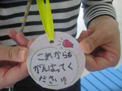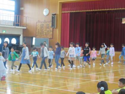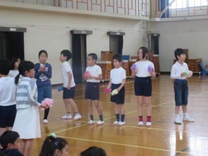 最後に全校で歌を歌ってお祝いしました。そして,拍手に送られて1年生が退場しました。4年生は,前での発表ではなく,1年生に心をこめてメダルをつくってくれたり,退場の花道を飾ってくれたりしました。心あたたまるすてきな会になりました。学校にも慣れた1年生は,今後,室町小学校の一員として活躍してくれることでしょう。