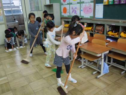 その後の掃除時間には,子どもたちだけで掃除をする姿には,びっくりしました。掃除をすることがとても楽しいようで,はりきって掃除をしています。