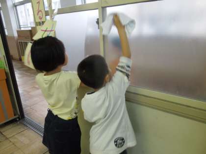 「ほうきを使うのは難しいね。」「机はごしごしするとピカピカになるよ。」と楽しそうでした。