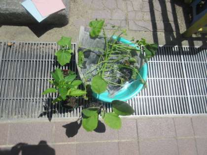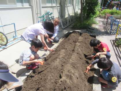 みんなで力を合わせて,さつまいもやピーマン,トマトなどの野菜の苗を植えました。
