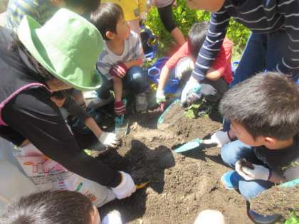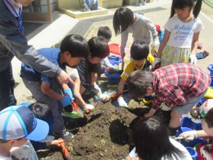 2年生も花壇の土づくりをしていました。土に肥料を混ぜ,栄養のあるよい土をつくりました。自分の植木ばちに,ミニトマトやきゅうりなどの野菜を一つ選んで植えました。
