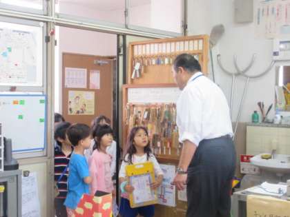 職員室では,教頭先生に自分の名前と用件を言って,中を見せてもらいました。「たくさんパソコンがあるな。」「かぎがいっぱいかけてある。」など,色々なことを発見していました。