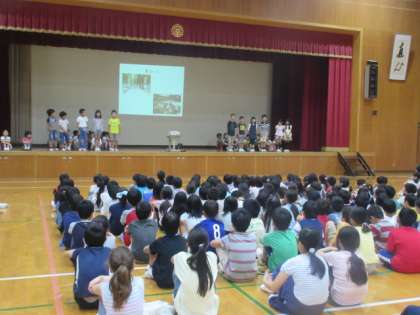 今日は,3年生の室町タイムでした。3年生は,遠足や総合的な学習のことについて発表しました。遠足で大文字山に登り,頂上からの景色がとても美しく,室町小学校も見つけることができてうれしかったことを話していました。また,町探検に行き地域には西陣織に携わっておられるところがたくさんあることを知り,西陣織についてくわしく学習していること,今度,西陣織を織る糸を出す蚕を育てることなどについても話してくれました。