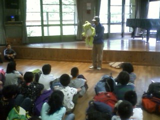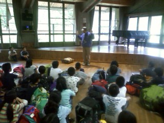 山の家に到着しました。みんな元気です。微妙な小雨が降っています。 大事を取って館内で入所式です。