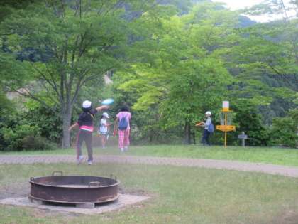 野外炊事が終わり,部屋でくつろいだ後,屋外で,フライングディスクゴルフを楽しんでいるところです。
