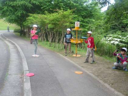 スタート地点から,フライングディスクを投げ,できるだけ少ない回数で,かごのようなところに入れるゲームです。いろいろなコースがあり,坂道もあるのでへとへとになりながらも楽しんでいます。