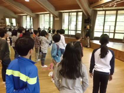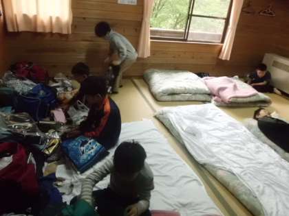 朝6時に起床し、お天気を気にしながら荷物整理をしました。朝の会では予定の確認、ラジオ体操などをしました。朝食を済ませ、お弁当をもらい予定を若干はやめて山へ向かいます。