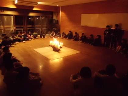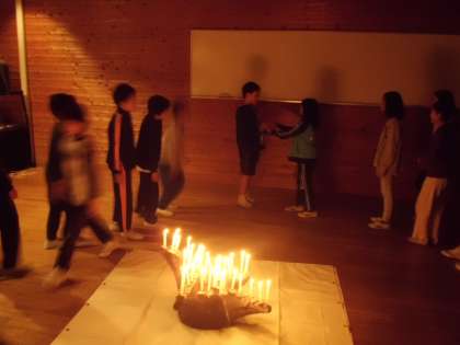 おはようございます。昨夜は雨のため館内でのキャンドルファイヤーとなりました。野外で出来なかったのは残念ですが、みんなは熱い熱気の中、汗だくになりながらも楽しく盛り上がっていました。爆弾ゲームやドンじゃんけんゲーム、フォークダンス等々。責任・協力・感謝の火のもとに集いました。