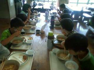 振り返りの後は,昼食を食べました。花背山の家での最後の食事です。主食は,味噌ラーメン,鶏照りたま丼のどちらかを選べました。味わって友達と楽しく食べました。