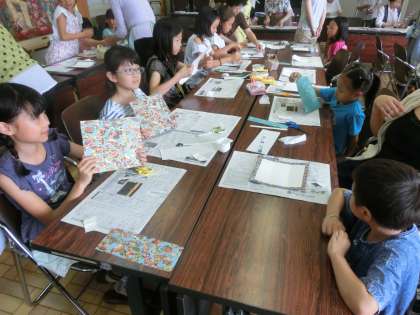 最初に,切り開いた牛乳パックに飾り和紙をノリではります。女性会のみなさんに教えていただきながら,丁寧に飾り和紙を貼っていきました。