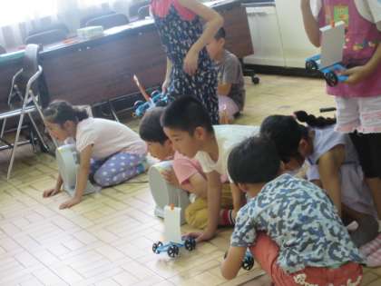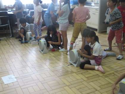 帆をつけた車に,風を当て走らせます。風をさえぎったり弱くすると,あまり進まず,強い風をうまく当てると部屋の隅まで車は走っていきました。みんな楽しそうに熱心に取り組んでいました。