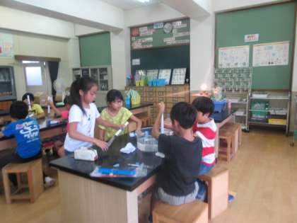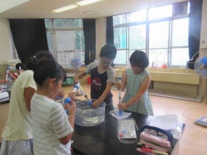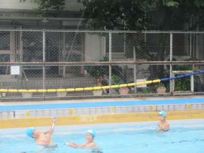 その後,水泳の時間の前に水鉄砲で遊びました。遠くまで水が飛ぶ様子をみんなうれしそうに眺めながら夢中になって遊んでいました。