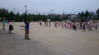 本日,7月25日(月)7時30分から本校校庭でラジオ体操が始まりました。室町体育振興会さんの主催で,ラジオ体操第1,第2が行われました。