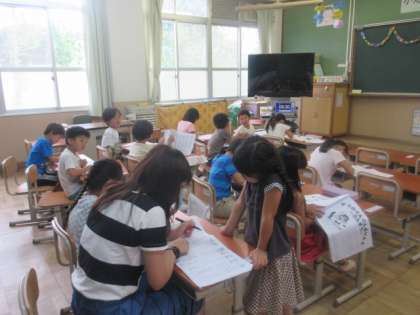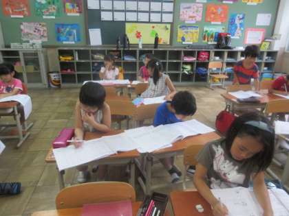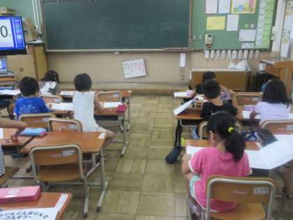 今日からサマースクールが始まり,多くの子ども達が参加しました。1年生の教室をのぞくと,計算プリントに取り組んだり,夏休みの宿題の分からないことろを先生に尋ねたりしていました。