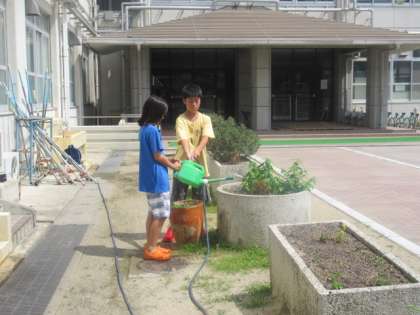 今日も園芸委員の子どもたちが,学校に来て水やりをしてくれていました。ホースやじょうろを使って,ていねいに水やりをしていました。今日も暑い日なので,植物たちも喜んでいることでしょう。