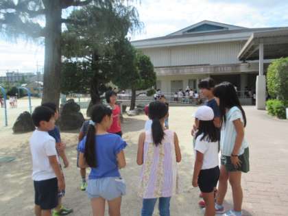 今日は7日。7のつく日は「なかよし遊び」の日です。たてわりグループに分かれて遊びました。6年生のリーダーさんのところに,他学年の子ども達が集まり,活動スタートです。鬼ごっこをしたり,かくれんぼをしたりして楽しく遊びました。