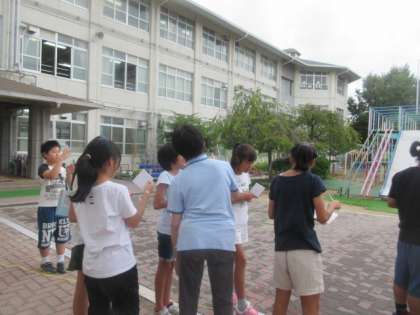 測定版を作り,それを使って,運動場に出て木の高さを測定します。担任や中学校の先生のアドバイスを受けながら,みんな熱心に測定していました。高い木も工夫すれば高さが測れることがよく分かったようです。