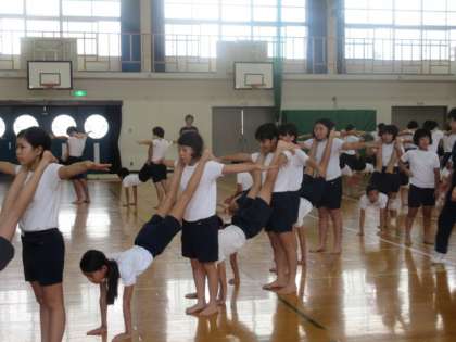 今日は,この間,行った2人技の復習を行った後,音楽に合わせて1人技・2人技を通して行いました。みんな真剣な表情で取り組んでいました。サボテンもずいぶん上手になっていました。今後も安全に気を付けながら進めていきます。