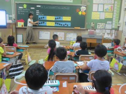 1年生は,夏休み明けより鍵盤ハーモニカの学習をしています。楽器の扱い方を学んだあと,ドレミの鍵盤の位置を覚え,簡単な曲を演奏する活動を行ってきました。