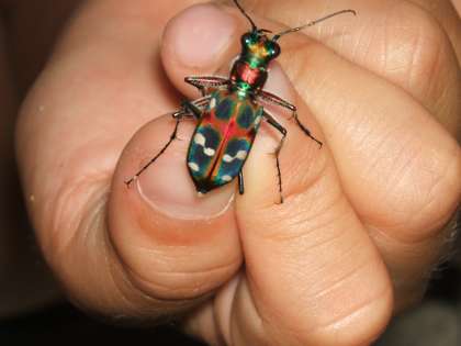 と提案。虫の大好きなH君が,すばやく動き回るハンミョウを上手につかみました。顎が大きく,持ち方によってはかまれてしまうようで,H君は見せに来るまでに鼻の頭をかまれたそうです。だんだん慣れてきて,きれいな紋様をカメラの方にうまく向けてくれました。